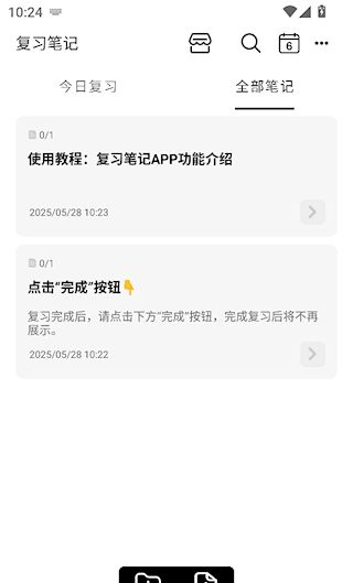 1、进入复习界面,可以看到今日需要复习的笔记,复习后点击笔记下的完成。
