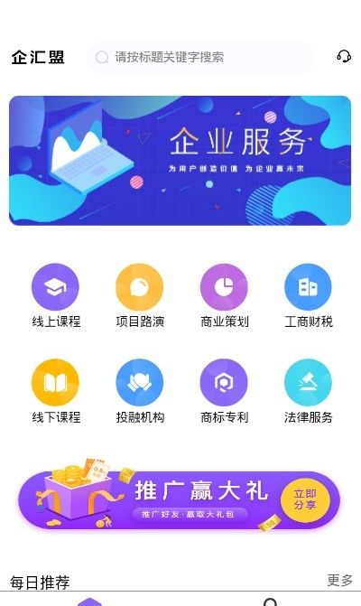 企汇盟是一个专业的企业一站式综合服务平台,具有在线课程、项目路演、商业策划、工商注册、线下课程、投资机构、商标注册、法律财税等功能,等企业联盟应用为用户创造价值,为企业谋求发展,可以推广和赢得大礼。