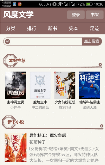 风度文学在这里你可以观看到最新最热门的小说,拥有海量的小说资源,让你每天看不停,软件里无任何的广告给你一个非常清爽的小说阅读器,里面有推荐好看的网络小说,全站阅读无弹窗广告,全本小说免费阅读,小说资源还算是丰富的,同步更新各大热门小说,让你不在为找不到小说看而烦恼。