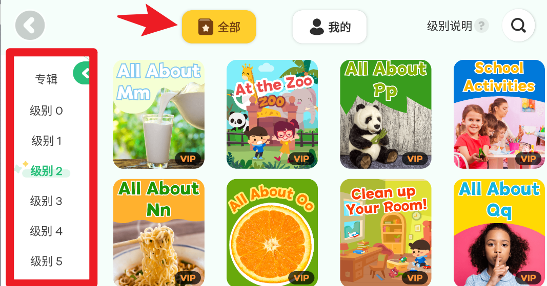 3、在图书馆页面,通过左侧筛选“级别”或“专辑”,右侧即可浏览各类分级绘本,选择适合孩子当前阶段的图书。