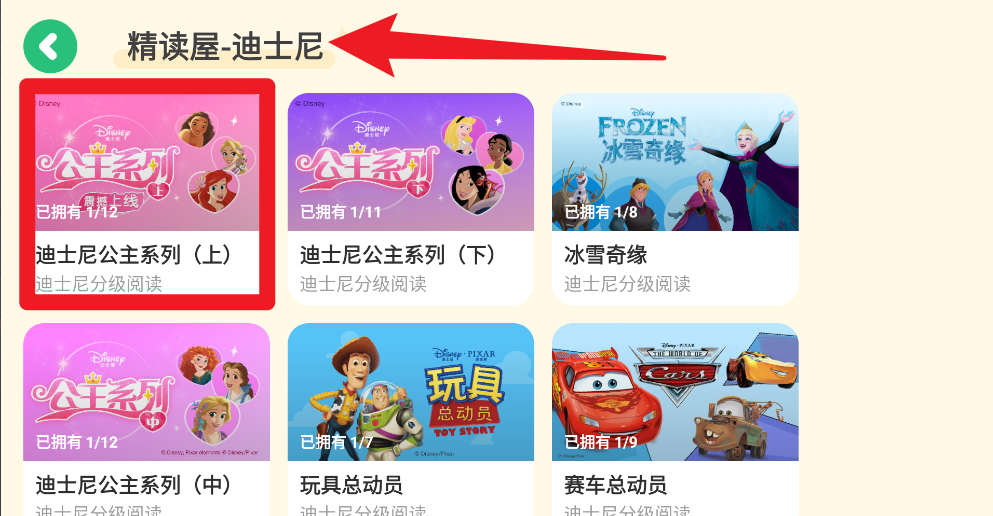 5、“精读屋”中包含丰富正版主题内容,如迪士尼公主、冰雪奇缘、玩具总动员等分级绘本供深度阅读训练。