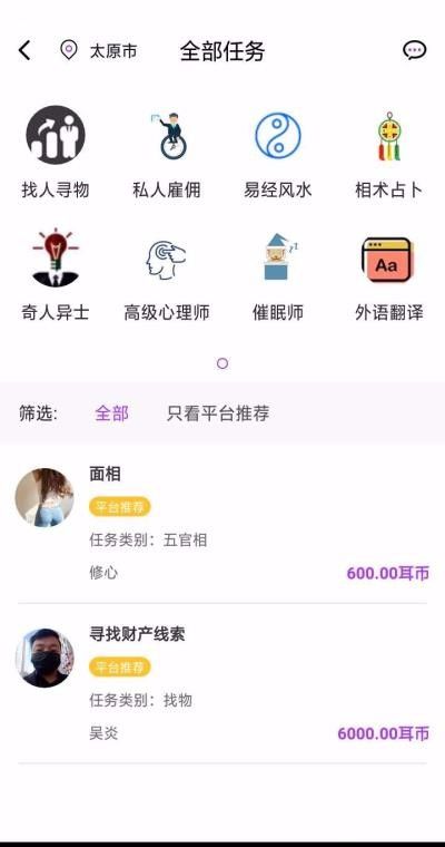 心耳在线属于线上特殊任务雇佣平台,平台汇集多个特殊领域的专业人士,如果自己发布的技能任务被人受理了之后就能得到信息的反馈,而自己只需等待对方为自己提供上门服务即可,非常便捷,更好用的是,如果自己是一个具备技能的人则可以入驻这里接任务赚钱,非常实用。着重解决寻人找物、易经风水,相术占卜、私人雇佣,催眠师等特殊领域棘手的问题。