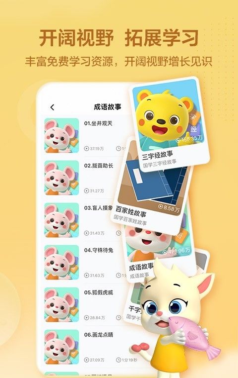 2、涵盖了洪恩的英语、阅读、数学、国学、音乐等优质课程的学习内容。课程体系科学完善,教学内容全面系统,教学方法先进实用;