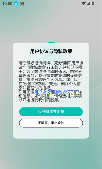 1、打开软件,我们需要仔细阅读相应的用户协议与隐私政策,然后点击同意并进入下一步。