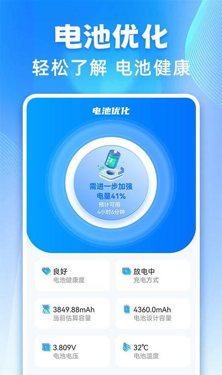 电池医生检测是一款手机必备的电池检测工具,拥有全新的界面设计,用户可以直接进入首页中自动检测电池信息和状态,轻松了解手机电池数据,随时享受便携的电池优化过程,还自带多样化的充电模式,允许用户轻松应用设置,随时随地快速充电,给用户带来全面的服务和体验,还具有丰富的功能和选项,可以自由查看手机信息并保护手机电池健康和隐私,能完全满足所有使用需求,有需要的用户欢迎下载软件。