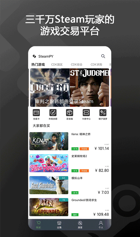 Steampy官网版是steam交易市场平台,为steam用户提供安全、快速、可靠的游戏交易体验。很多时候,我们在steam上买游戏大多是原价购买,但是有了这个平台就可以超低价格购买游戏。 每天都会更新各种超低折扣活动来购买游戏CDkey,Steampy官网版为游戏平台充值非常安全可靠的steam充值卡,大大节省用户的购买费用。感兴趣的朋友不要错过下载Steampy官网版。