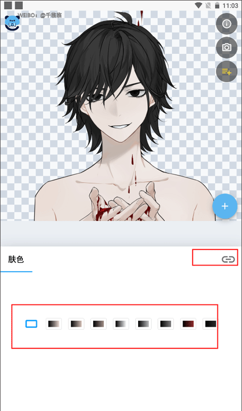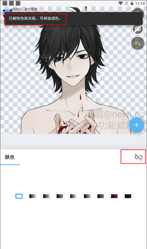 3、这时页面下方就可以对肤色的颜色进行自定义调色了。如果想单独进行调色,就可以点击肤色右边的链接功能图标,上方就会有文字提示你可以单独调色。