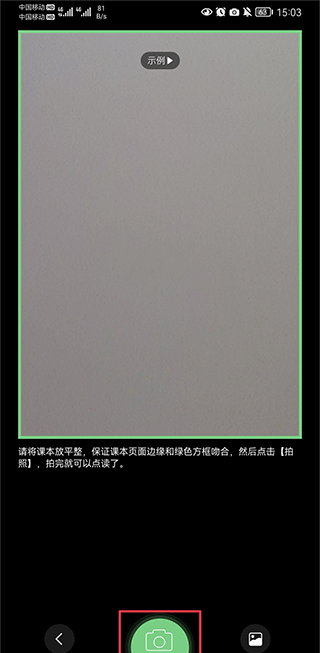 4、若里面没有你要的课本可以点击拍课本功能,然后将课本放平,保证课本页面边缘和绿色方框吻合,然后点击拍照就可以点读啦