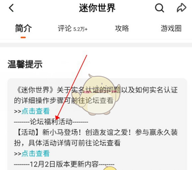 3、下滑找到温馨提示,温馨提示中的论坛活动就是可以获取皮肤的活动了,基本每周都会进行一次更新。