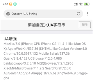 打开浏览器设置》高级设置,找到选项“添加自定义UA字符串”把下面的字符作为自定义UA。