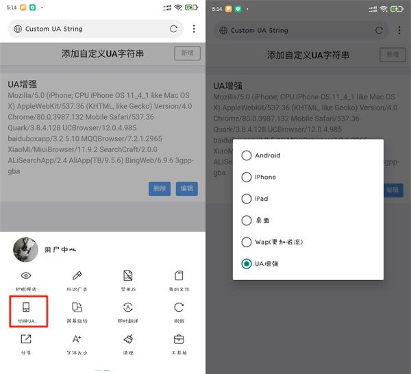 打开浏览器主菜单第二屏,找到选项“切换UA”,把刚才新自定义的UA作为浏览器默认UA。