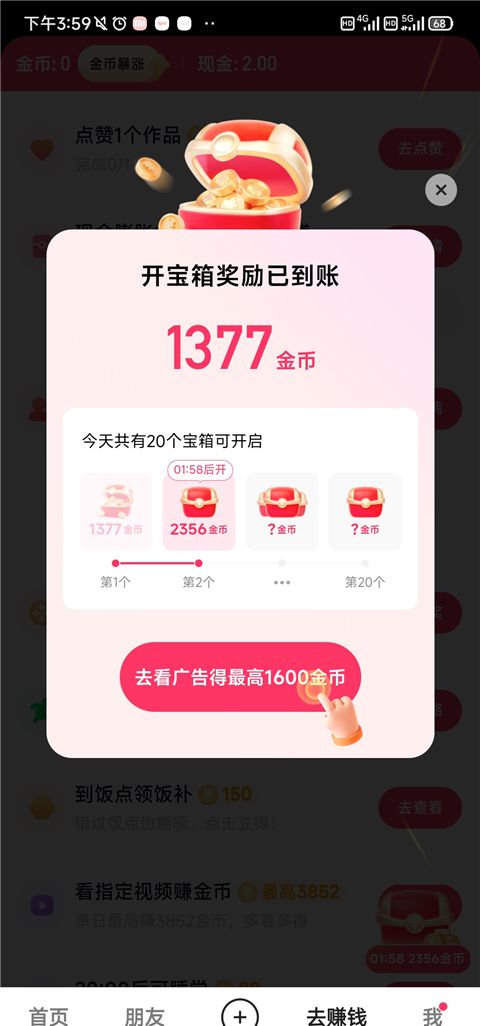 很多金币任务(如开宝箱后、完成任务后)会提供"看广告得更多金币"的选项,看完广告能获得显著更高的金币奖励。这是主要金币来源之一。