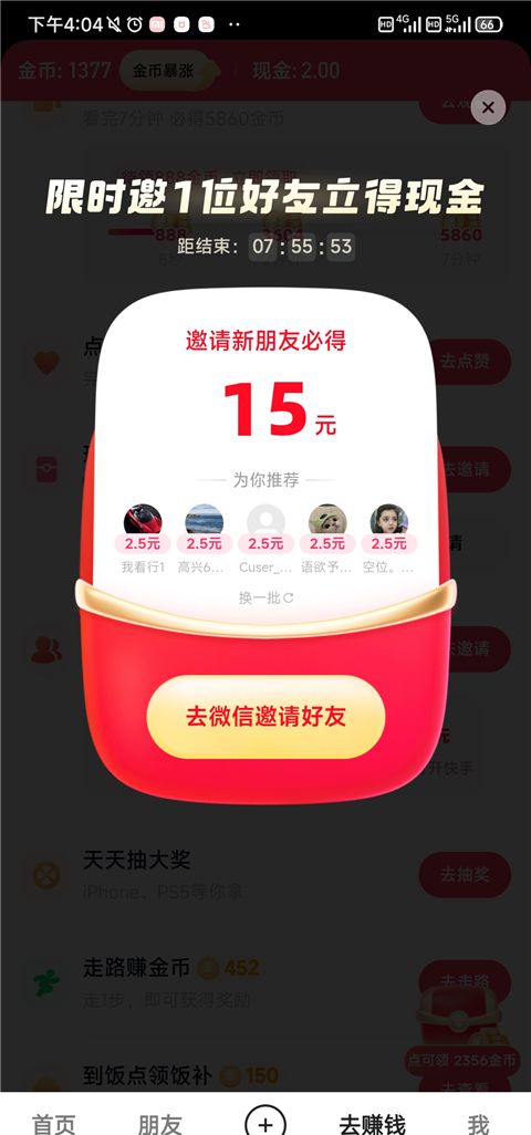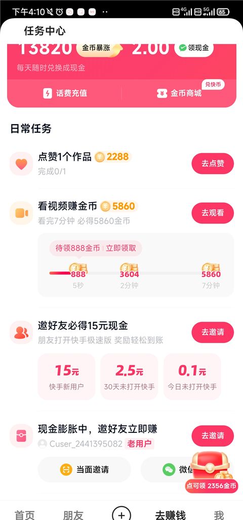 App内"任务"或"去赚钱"页面会列出每日任务。
