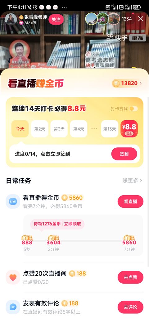 进入直播间观看,适当发言互动,停留足够时间,也能获得金币奖励。