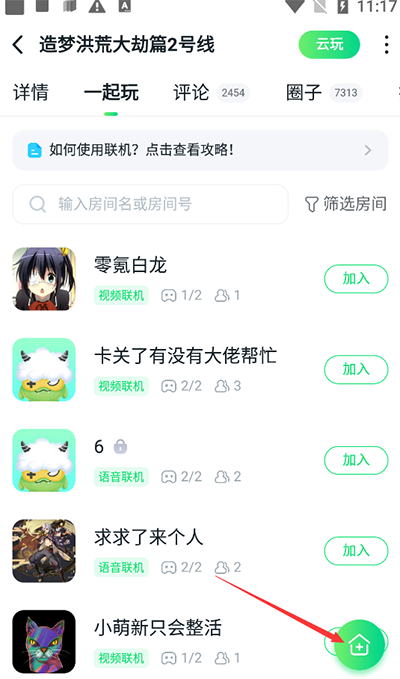 3、可以加入别人的房间一起联机,也能自己创建房间和朋友一起联机,自己创建房间就点击小房子。