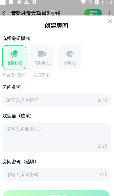 4、输入房间的模式、名称、密码等。