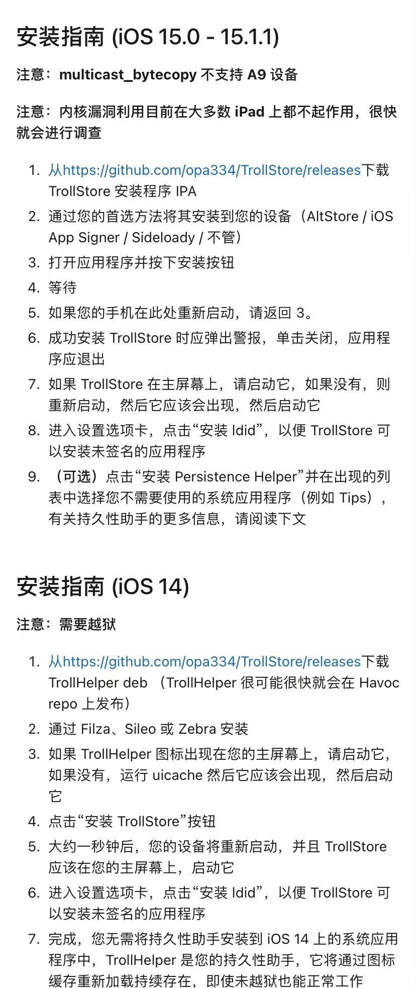 【TrollStore 安装使用教程】TrollStore 可以让 iOS/iPadOS 14.0-15.1.1 设备免电脑安装永久版绕过签名验证的免签名 App,之后 LinusHenze 公开 Fugu15 安装方法后 TrollStore 也将更新支持 iOS 15.2-15.4.1(15.5b4)