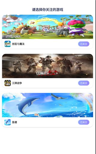 1、打开摸鱼社app,会提示你需要关注的游戏,任意选择一款你需要的;
