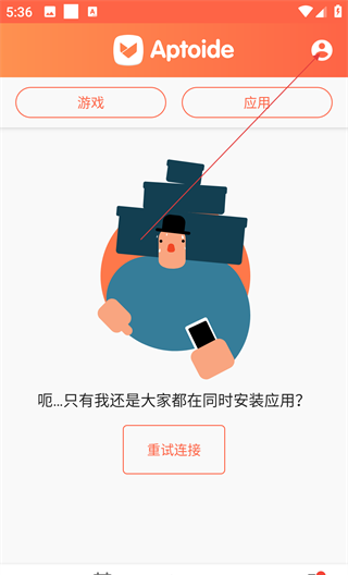 1、Aptoide是第三方安卓应用商店,其首页分为【游戏】和【应用】两个板块。如果遇到连接问题,可以点击“重试连接”恢复访问,该功能支持用户自建应用商店。