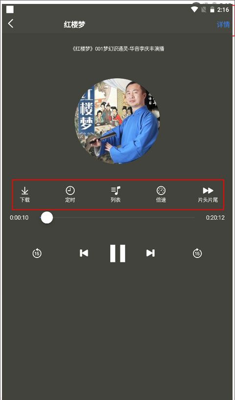 4、当你点击播放界面就会自动进入音频播放界面,下方的功能可以根据情况进行设置,如定时、倍速等。