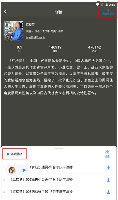 3、在书籍详情页面中你可以点击左下角的全部播放功能,也可以点击添加至书架。