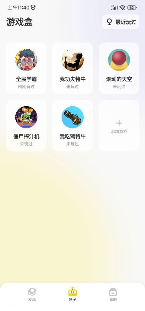 3、点开盒子,玩家可以查看你最近玩过的游戏,这里小编玩了全民学霸、我功夫特牛、滚动的天空等热门游戏;