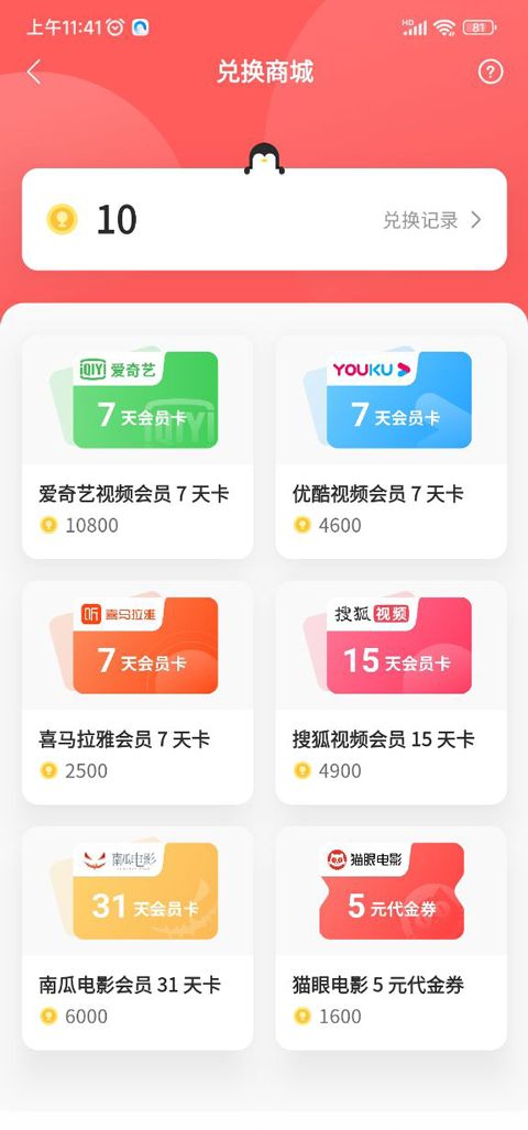 5、当然玩家还可以赚取积分,从而用积分来兑换爱奇艺视频会员、优酷视频会员等福利。
