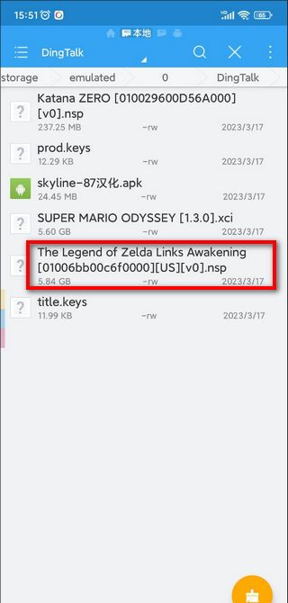 2、拿塞尔达传说织梦岛为例,这是1.0.0原版的nsp游戏rom,下载完毕后放到手机任意文件夹,记住位置。