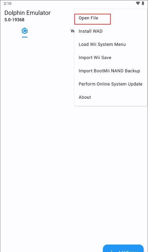 1、想要将手机上的游戏导入进来,首先点击右上角三点中的“Open File”或右下角的“Add Games”。