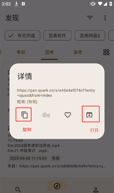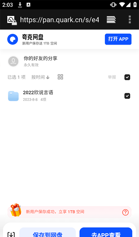 6、复制链接的话就让前往对应网盘app内打开,直接打开资源链接可以在线保存至目标网盘内