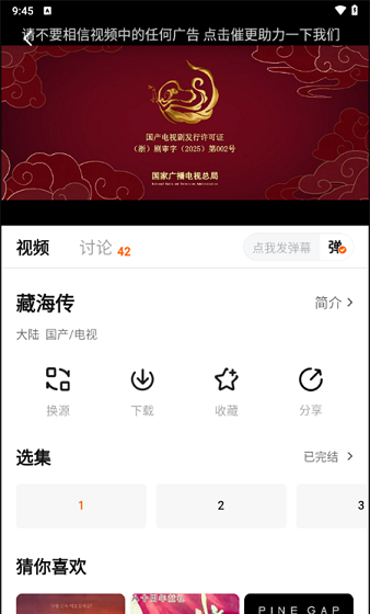 4、我们随便点击一部电视剧,我们能够看到弹幕、换源、下载、收藏、分享等一系列功能。