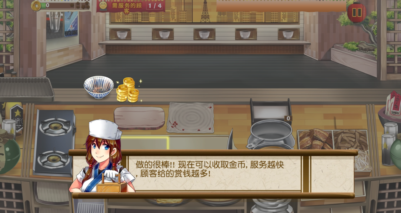 5、顾客吃完拉面会留下金币,你需要及时收取。