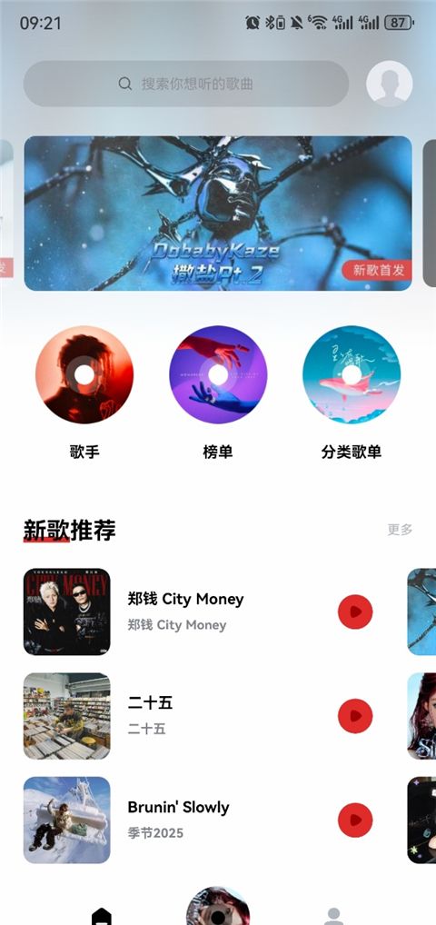 1、用户进入界面时,可以在页面上预览新歌和搜索歌曲,下面有推荐的歌手。