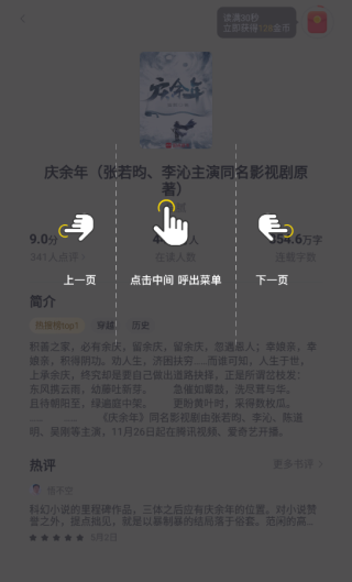 3、点击屏幕中间可呼出菜单,滑动左右两边可进行翻页。