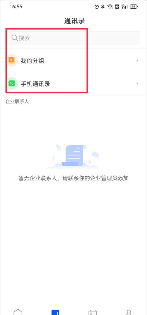 点击通讯录的搜索框,进入搜索页面,可对通讯录中的“我的分组”、“手机通讯录((手机端)”、“企业通讯录”的全部数据进行搜索。
