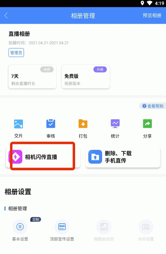 选择相册——点击“相机闪传直播”按钮——选择“普通闪传”和照片分类——选择“有线闪传”——进入闪传页面 (若使用闪传精灵,请点击这里查看操作说明)