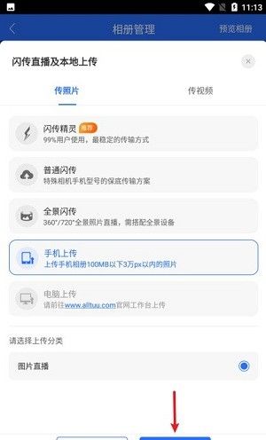 选择【手机上传】,选择上传分类,点击【确定】;