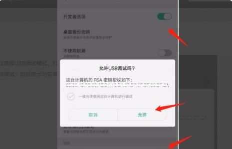 3、在设置界面中启动开发者选项和USB调试功能,并根据提示允许USB调试;