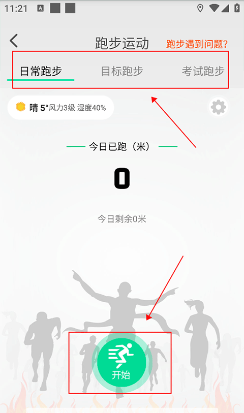 2、进入跑步锻炼界面后,选择日跑、目标跑或试跑,然后点击开始按钮。