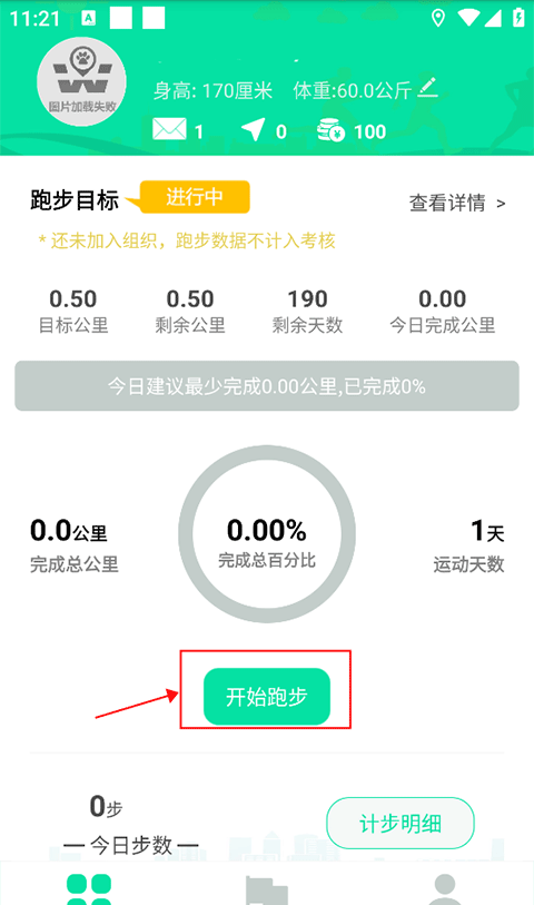 1、打开位动酷跑APP,进入首页,点击开始跑步按钮。