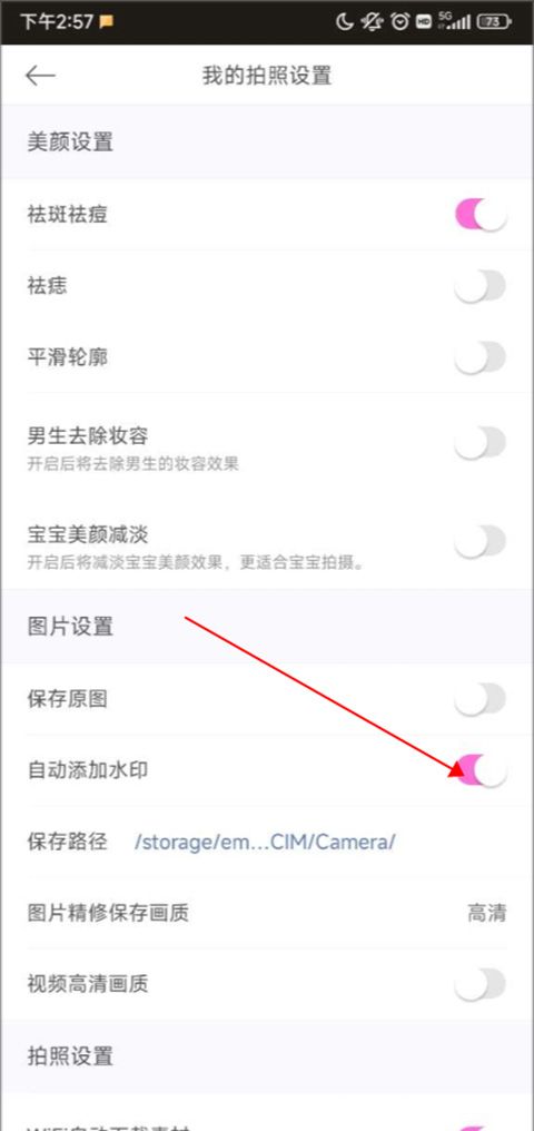 3、将“自动添加水印”按钮左滑关闭,即可去水印了。