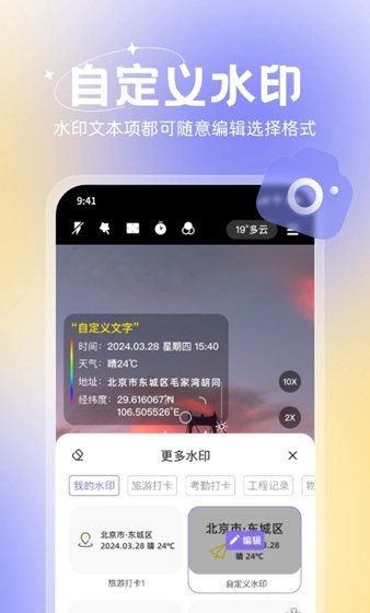 无双水印相机除了为用户带来强大的拍照功能外,还配备了十分强大的编辑工具,各位可以根据自己的需要来自由调整水印的位置、大小和透明度等属性,满足用户对水印的个性化需求,让各位能够轻松的定制照片水印,带来丰富的体验。