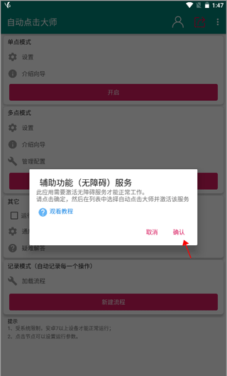 1、打开app之后页面上弹出了一个小窗口,上面显示“此应用需要激活无障碍服务才能正常工作……”,看完就可以点击下方的“确认”按钮;