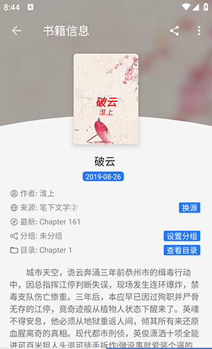 4、点击对应的小说,详情页面提供了加入书架,开始阅读以及切换书源等功能。