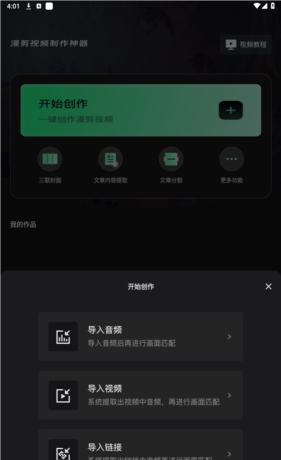 2、这里是直接通过三种导入方法,可以导入音频、导入视频、导入链接,以导入视频为例。