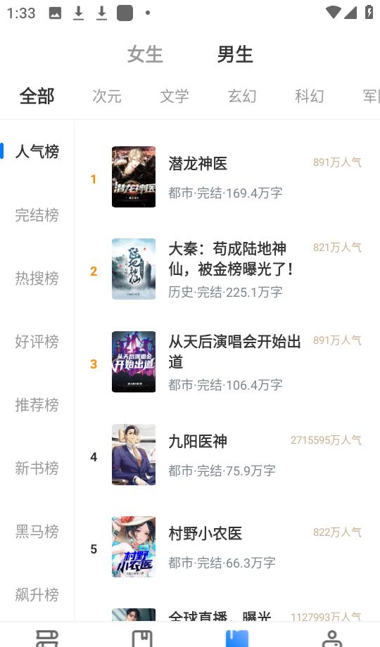 3、接着点击下方的“书城”,我们可以看到各种不同类型的小说资源。
