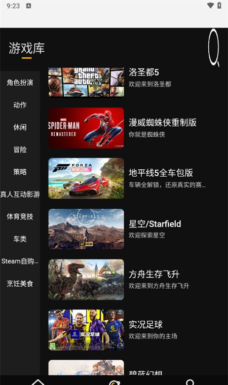 2、再游戏库界面下,我们能够看到合理的游戏分类,包括了:角色扮演、动作、休闲、冒险、策略等等。