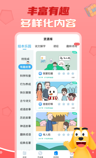 4、“0识字 ”也不怕!推送字词绘本,开启文字阅读之门:从最基础的字词开始根据识字量的增长不断更新列表,更早地感受阅读,培养习惯;