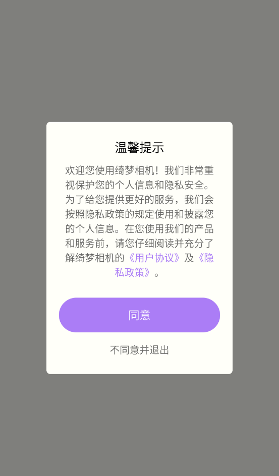 1、先在本站下载安装绮梦相机app,查看相关用户的协议和隐私政策。