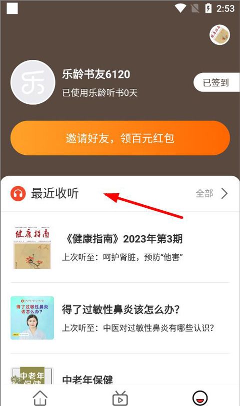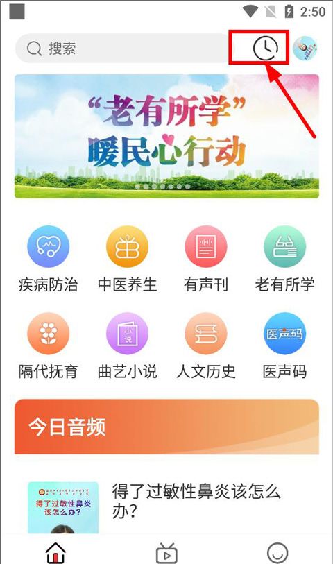 1、打开乐龄听书app进入听书主页,用户可收听进入音频、观看今日视频以及特别推荐等栏目,点击主页右上角时钟标志;